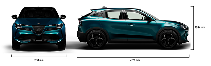 Wymiary zewnętrzne Alfa Romeo Junior Ibrida Q4 przekładają się na idealne proporcje kompaktowego samochodu sportowego: 4173 mm długości, 1544 mm wysokości i 1781 mm szerokości, bez lusterek bocznych. Obszerny bagażnik ma aż 340 litrów pojemności, co wystarczy nie tylko na codzienne zakupy, ale i na spory bagaż. Alfa Romeo Junior Ibrida Q4 sprawdzi się więc jako uniwersalny i praktyczny samochód na co dzień i na dłuższe podróże.